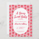 Strawberry Baby Shower Invitation with a cute pink and red strawberry pattern background and white arch frame for the text, makes a modern baby shower invitation for your very special baby girl celebration.