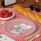 Strawberry time! Cute Strawberry themed first birthday fixings, is ideal for a girl who loves sweet berries. Gingham background for a down-home on-the-farm look that is just the thing for a party of pies, berry topped desserts, fresh fruits, and everything that goes with it. Watercolor fruits and tiny heart accents. Strawberry pink and white.