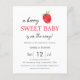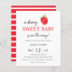 Simple and modern strawberry baby shower paper invitation featuring a watercolor strawberry on a clean white background. With the words " a berry sweet baby is on the way " and stripe red and white reverse. Ready for easy personalisation.
