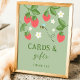 Welcome your guests with this adorable Berry Sweet strawberry cards and gifts sign! Featuring hand-drawn strawberries, cheerful white daisies, and a buzzing bee on a soft green background, this strawberry-themed party sign adds the perfect touch of charm to your gift table.