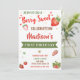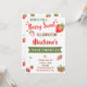 This girl birthday invitation features big red strawberries and several flowers.