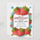 Celebrate your birthday with these fun strawberry invitations. In the centre of the invitation are templates to add all your details inside a white box with a dark maroon edge. Around the detail box are juicy red strawberries with green leaves. Also scattered about are cute blue flowers and pink love hearts.