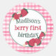 These strawberry birthday party stickers are perfect for a sweet girl's berry 1st birthday! It has lots of berries and a pink plaid pattern for a farm or picnic styled party. It's a great option for labelling favours, embellishing envelopes, or decorating! © 2023 Tea Olive Co.