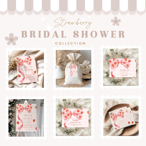 A sweet and playful bridal shower design featuring a pink gingham background, juicy strawberries, and an oversized ribbon bow. Perfect for a bride who loves feminine, Y2K, or coquette aesthetics. Ideal for a Malibu summer shower or any whimsical celebration with a fruity twist.