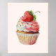 Poster with a yummy illustration featuring a delicious looking cupcake. White cream and a big strawberry adorn this yummy sweet treat.