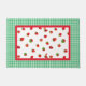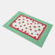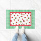 This bright and colourful kitchen rug features a green and white gingham check plaid with a strawberry pattern in the middle. A faux red ribbon borders the strawberry pattern.  There is a coordinating oven mit, pot holder, kitchen towel and an apron in our shop too!