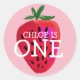 Custom printed birthday stickers: a cute idea for baby's first birthday party decorations! A giant illustrated red strawberry on a pink background.
