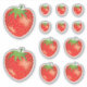 Destei's cartoon illustration of a red strawberry in different sizes.