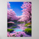 A calm still pond lies at the heart of a serene landscape, surrounded by cherry blossoms in full bloom. The delicate petals of the blossoms reflect in the mirror-like surface of the pond, creating a peaceful and harmonious scene. This digital artwork captures the essence of tranquillity, inviting you to immerse yourself in the beauty and serenity of nature.