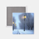 Victorian street lamps glowing softly on a snowy winter country lane.