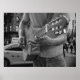 A classic, retro-style urban poster depicting a man play his guitar with city traffic background. Vintage black and white photography of the street musician. Superb for any modern room wall and minimalist home decoration.