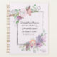 A pretty feminine Christian planner, with a hand drawn frame with watercolor flowers in pastel pink and lilac. Inside the frame is an editable Bible verse from Proverbs 31:25 Strength and honour are her clothing; She shall rejoice in time to come" (NKJV) in dark grey hand written style font. Personalise with your name. Makes a great gift.