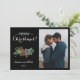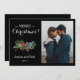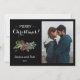 Striking, black Christmas card customised with your favourite photo. Personalise with your names and the year on the left. Beautiful watercolor holiday bouquet with pine boughs, red berries, and pinecones. Reverse side is solid black with another arrangement of holiday greens, berries, and brass bells.
