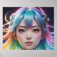 A digital character with luminous, multi-coloured hair and mechanised headgear gazes directly at the viewer with striking, large eyes. The background is dark, which emphasizes the vibrant colours of the hair and the futuristic elements of the headgear.