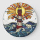 This round clock features a stylised illustration of a red and white striped lighthouse standing amidst swirling blue and white waves. A large, vibrant sunburst in warm yellows and oranges radiates behind the lighthouse. The clock face has clear numerals and black hands. The overall design is bold and graphic, evoking a sense of maritime adventure and sunny days by the sea.