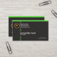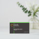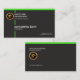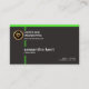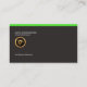 A simple plain design kept to a minimum using striking green outlines in a black background. A slim rectangle border the upper end of the card with two striking vertical stripes crossing the face of the card. At the top left corner there is the faux gold logo, its business name and URL. Directly underneath are your prestigious name and job title. At the card's floor rest your contacts.