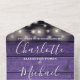 All in one wedding invitation featuring pretty string lights, mason jars, signature style names and chic typography on a rustic purple wood background. The invitation includes a perforated RSVP card with meal choice. Designed by Thisisnotme©