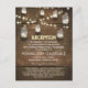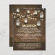 Country wooden style string of lights and hanging mason jars wedding reception cards.