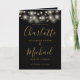 Black and gold signature script wedding program featuring pretty string lights and chic modern typography. This stylish wedding program can be personalized with your special wedding day information. Designed by Thisisnotme©