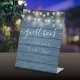 String Lights Blue Rustic Wood Script Guest Book Pedestal Sign