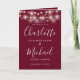 Burgundy signature script wedding program featuring pretty string lights and chic modern typography. This stylish wedding program can be personalised with your special wedding day information. Designed by Thisisnotme©