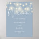 This elegant dusty blue wedding welcome sign, featuring pretty string lights, can be personalized with your information in chic typography. Designed by Thisisnotme©