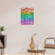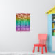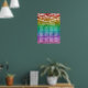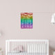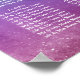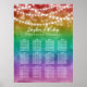 Rainbow coloured wedding seating chart for twelve tables. The gay wedding seating chart features white text against a watercolor ombre in rainbow colours. The top is adorned with painted string lights and bokeh.