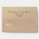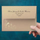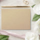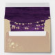 This elegant 5x7 wedding envelope features a modern rose gold exterior adorned with sophisticated gold floral lace for a touch of refinement. Inside, a rustic purple wood backdrop adds a charming contrast, complemented by delicate string lights for a hint of romance. The return address is gracefully positioned on the top flap, completing this stylish and unique design.