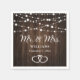 Decorate your rustic wedding party with these romantic Mr. and Mrs. wedding paper napkins featuring intertwined hearts against a rustic wood background adorned with elegant floral lace and string lights.