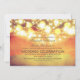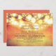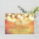 Elegant rustic vintage wedding invitation with string lights, lanterns and painted orange - yellow grunge background. Perfect invite for your rustic country wedding or outdoor wedding with twinkle and globe lights.