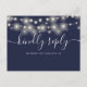 An elegant signature script RSVP card featuring pretty string lights and modern typography on a navy blue background. The reverse features your details and a fun guest song request. Designed by Thisisnotme©