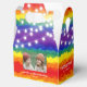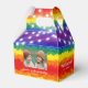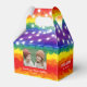 Joint birthday favour box featuring a colourful rainbow background and shinny string light, with vibrant typography and one photos of your choice.
