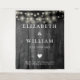 This string lights rustic black wood boho barn wedding backdrop can be personalised with your information in chic typography. Designed by Thisisnotme©