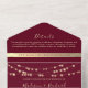 This romantic all-in-one wedding invitation features deep burgundy tones, soft gold floral accents, and glowing string lights—perfect for a cosy winter or elegant evening wedding. With a built-in RSVP and mailing panel, it’s a stylish and practical solution for couples looking to simplify their stationery suite without sacrificing beauty.