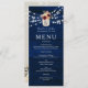 Celebrate your reception in style with this rustic navy blue wedding menu, featuring glowing string lights, elegant florals, and a romantic mason jar monogram. Perfect for barn, countryside, or fall and winter weddings, this design adds charm and warmth to any wedding table setting. Easily customise the menu items and couple’s names to make it uniquely yours.
