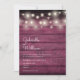 A stylish rustic wedding invitation featuring pretty string lights above the happy couple's names set in an elegant script above the special wedding details on a rustic burgundy red wood background. The reverse features a matching rustic wood background. Designed by Thisisnotme©