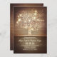 Charming rustic country engagement party invitation with old carved tree and hanging string of lights. Romantic wooden.