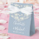 Elegant dusty blue wedding favour box featuring pretty string lights, stylish signature script names and special date set in modern typography. You can personalise with your own thank you message under the lid. A perfect way to say thank you to your guests! Designed by Thisisnotme©