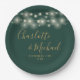 Elegant emerald green and gold wedding paper plates featuring pretty string lights, signature style names and your special wedding date. Designed by Thisisnotme©