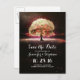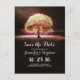 Rustic pink coral wedding save the date postcards with romantic old oak tree and dreamy string lights design. Beautiful vintage yet modern save the date postcards for nature inspired weddings.