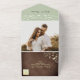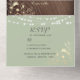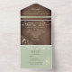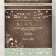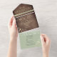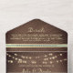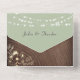 Elegant, boho, modern, chic sage green and rustic wood wedding all-in-one invitation with faux gold floral lace, string lights and custom picture of the couple at the back.