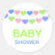 A cute design featuring colorful strings of hearts with the words 'baby shower' in bold, bright letters.