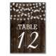 String of lights on old wood summer wedding table number featuring white twinkle glowing string of lights on the top on old brown wood background. This modern and trendy wooden wedding design is part of a wedding set or collection, is fully customisable and is perfect for an outdoor summer night barn western rustic wedding. Note that there is not real wood just printed images.