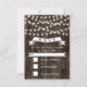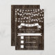 String of lights and vintage banner on old wood summer wedding RSVP reply/response card featuring a white banner with brown outline on old brown wood background. This modern and trendy wooden wedding design with vintage elements is part of a wedding set or collection, is fully customisable and is perfect for an outdoor summer night barn western rustic wedding. Note that there is not real wood just printed images.