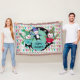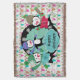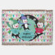 Beautiful Christmas holiday throw features three adorable penguins in ice skates, sweaters, striped scarves, and winter hats on a background white with strings of holiday tree lights, a black with white snowflakes area, and a centre of aqua blue with little white polka dots. You can easily personalise with your family name or text that reads Happy Holidays, Feliz Navidad, Merry Christmas, etc.!