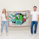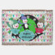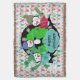 Beautiful Christmas holiday throw features three adorable penguins in ice skates, sweaters, striped scarves, and winter hats on a background white with strings of holiday tree lights, a black with white snowflakes area, and a centre of bright green with little white polka dots. You can easily personalise with your family name or text that reads Happy Holidays, Feliz Navidad, Merry Christmas, etc.!