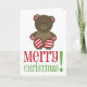 A Christmas card featuring an illustration of a brown stuffed bear with red and white striped paws and ears. Red and green text says "Merry Christmas!"