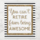 A black and gold glitter retirement wine label, which features the words "you can't retire from being awesome" in a gold glitter design. Please note there is not actual glitter, but a design effect.