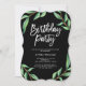 These elegant, dramatic birthday party invitations feature watercolor green botanical leaves on a black background, with trendy white typography. The back of the invitation has the same green leaves, plus trendy black and white stripes.