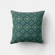 This throw pillow has an art deco design of diamond shapes with diagonal lines and coloured diamonds in two shades of teal.